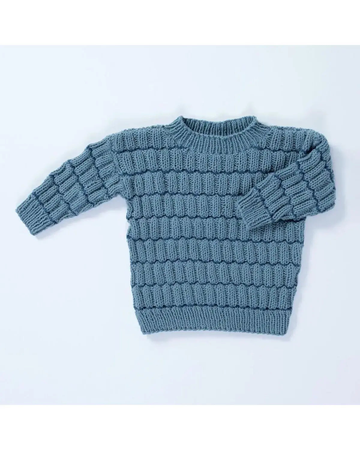 Boble Genser, Lys Denim er en trendy genser designet av Anne-Kirsti Espenes for Dale Garn. Denne genseren har en unik boblestrikke-design som gir et moderne og stilfullt utseende.