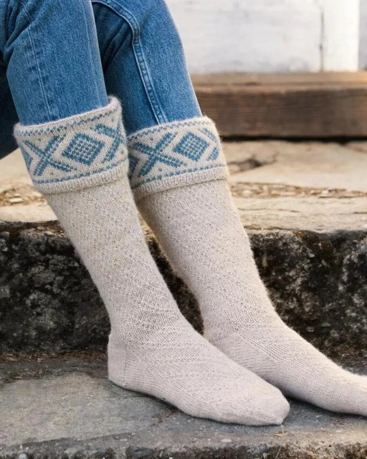 Strømpene er strikket i en vakker beige farge som passer til alle antrekk. De er laget med et deilig mønster og har en perfekt passform. Med disse sokkene kan du skape et klassisk og tidløst utseende som vil vare i mange år.