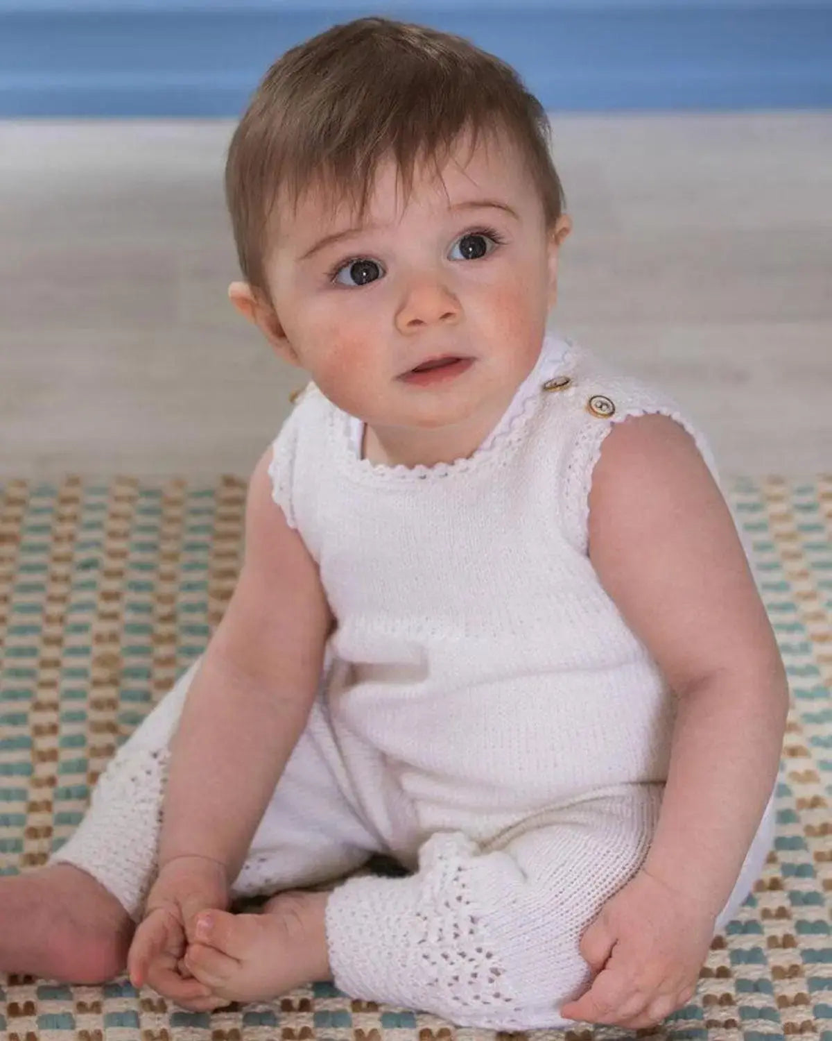 Genseren har en klassisk passform med rund hals og knapper på skuldrene for enkel påkledning. Den har også fine detaljer som ribbestrikkede kanter og en søt kabelstrikk på forsiden. Buksen har en elastisk linning og strikket ribbekant nederst for en behagelig passform. Sømmene er også spesielt utformet for å gi god bevegelsesfrihet for den lille.