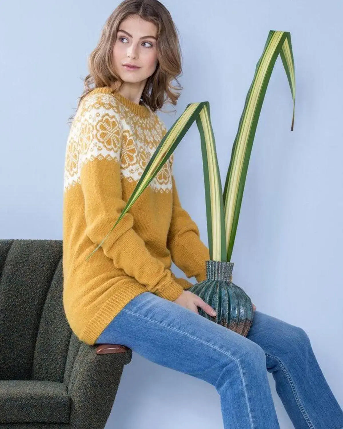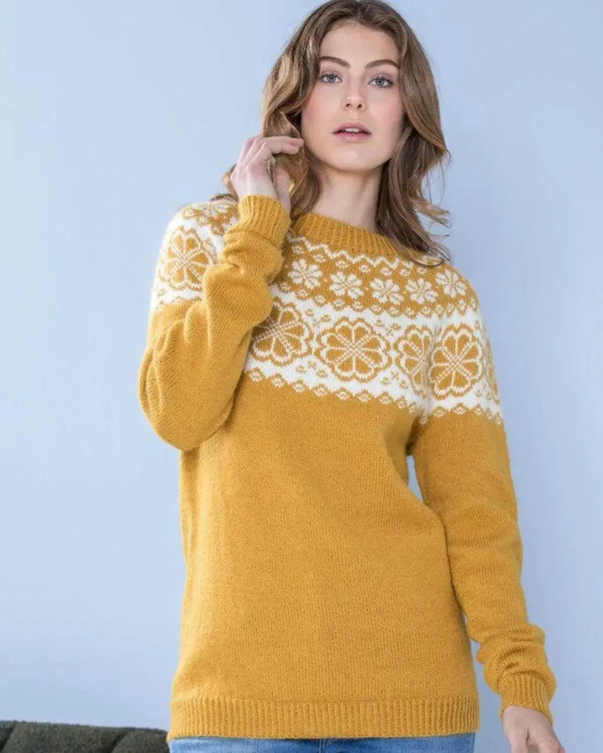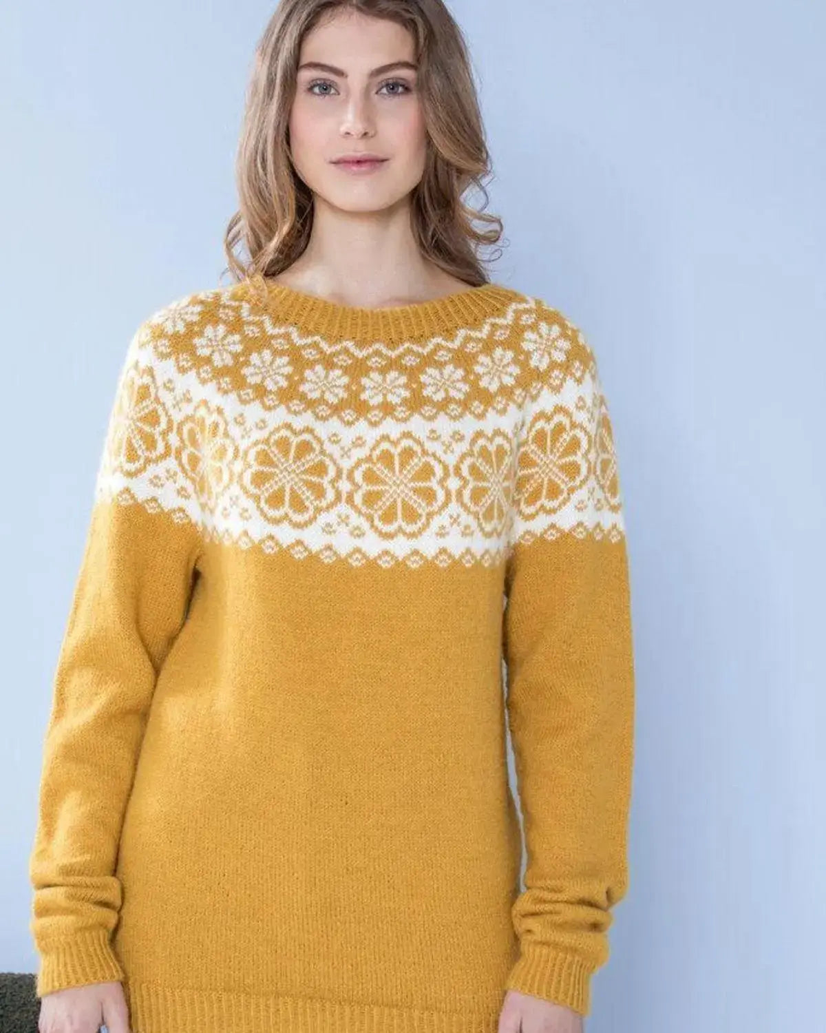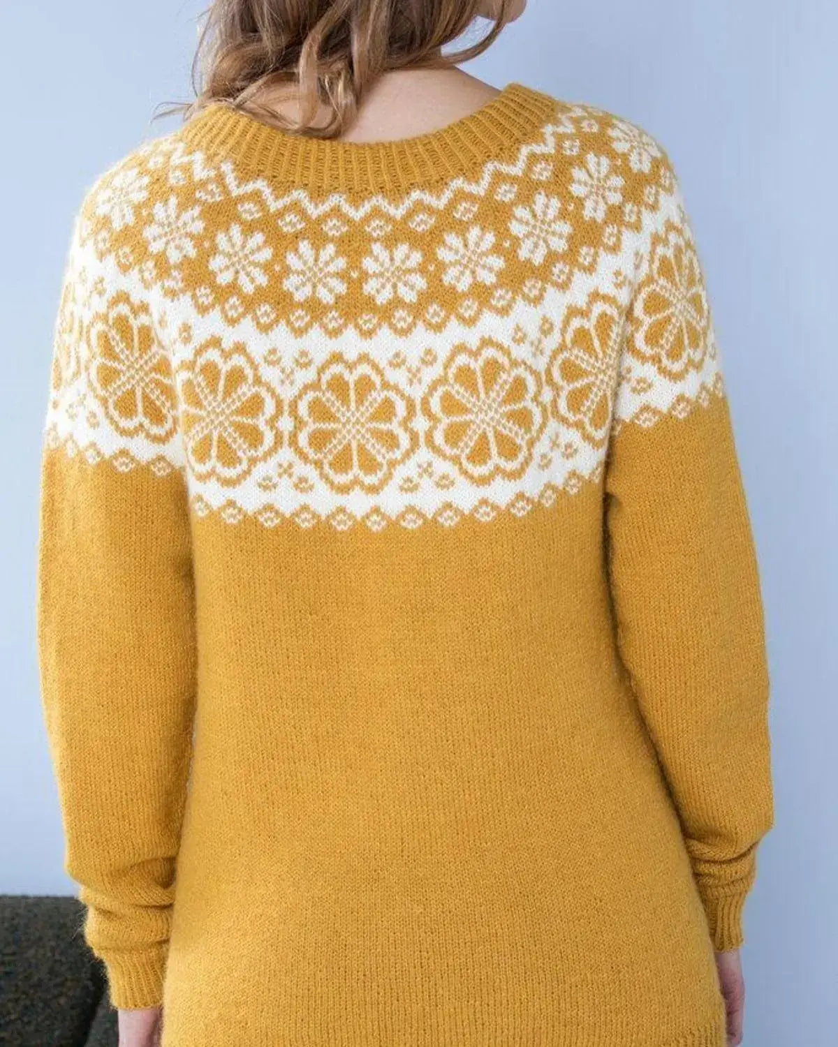 Genseren har et moderne og tidløst design med et klassisk mønster i maisgult og naturfarge. Den har en rund hals og lange ermer, og sitter fint på kroppen. Genseren er laget i en myk og varm ullkvalitet, som gjør den behagelig å ha på seg.