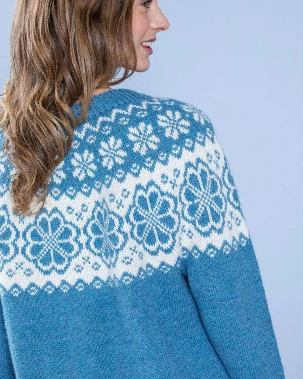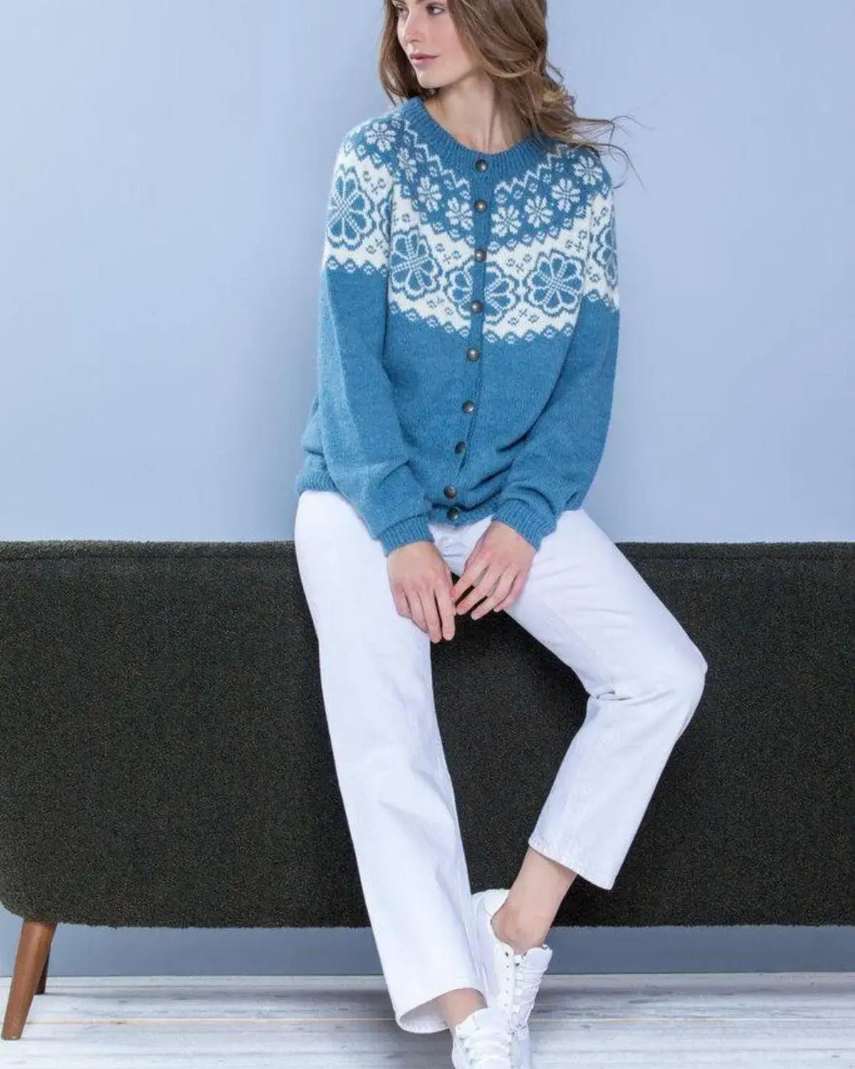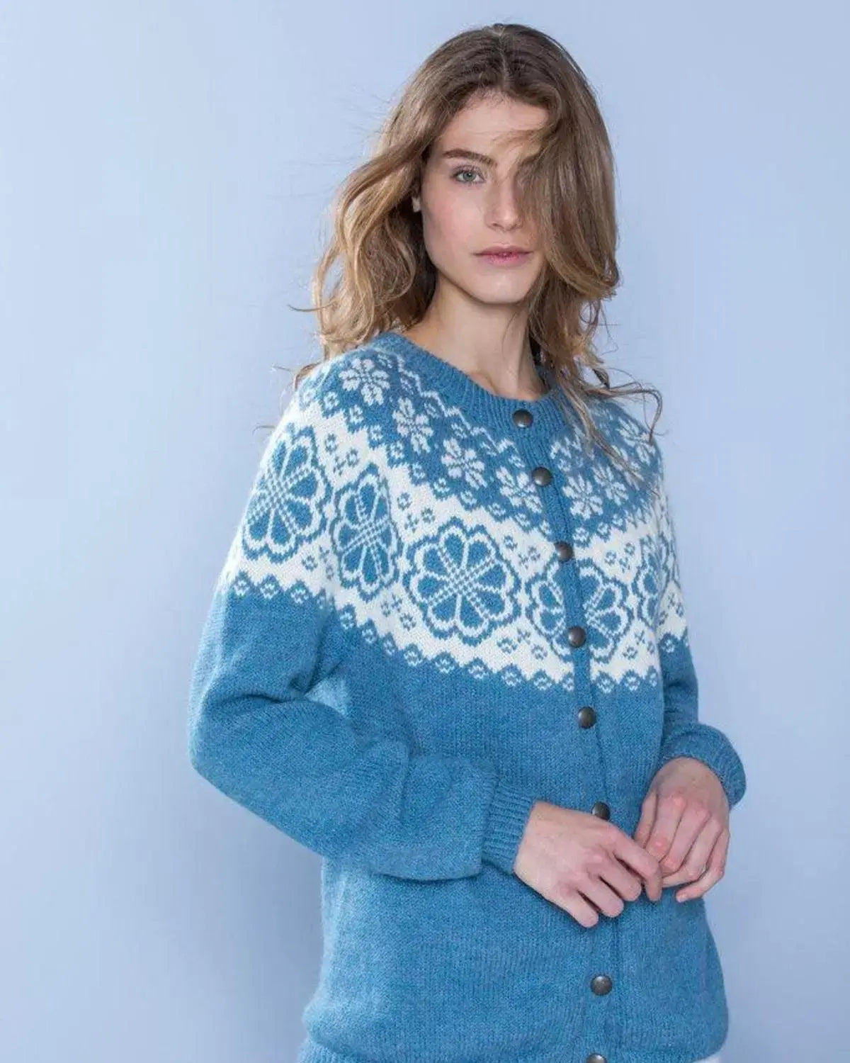 Koften er laget av det myke og varme garnet Dale Alpakka i fargene Lys Denim og Natur. Den har et flott mønster av snirkler og ruter som gir et vakkert og intrikat uttrykk. Koften har en feminin passform med en litt innsvinget midje og lange ermer.
