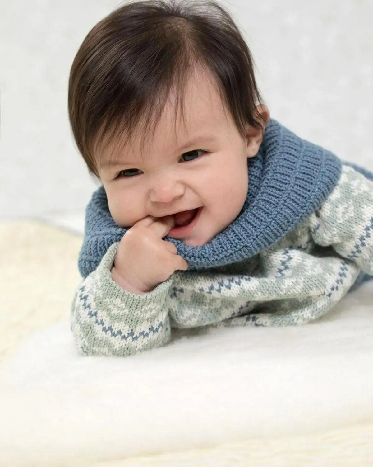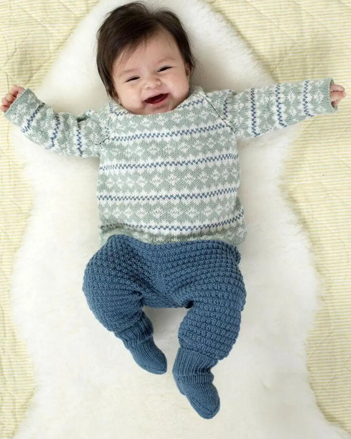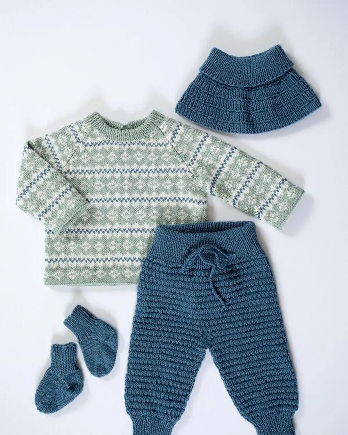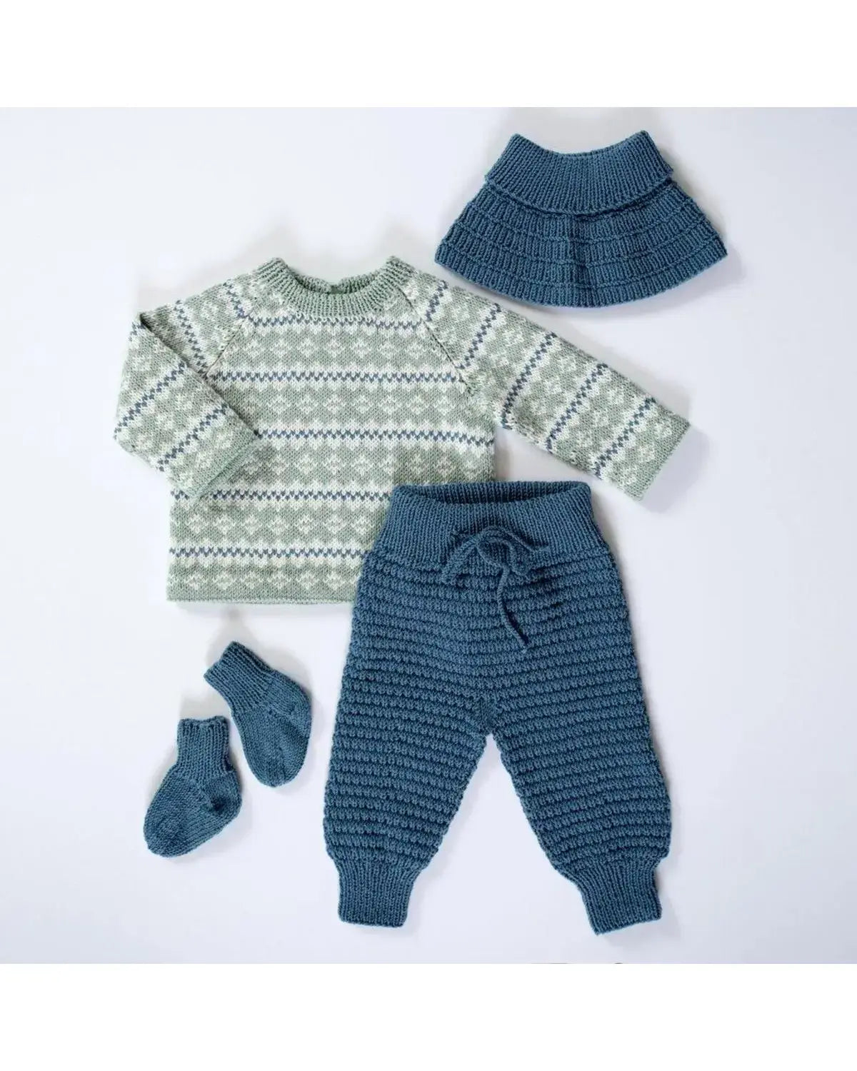 Smårolling Genser, Lang Bukse, Hals og Sokker i jeansblå er et flott og komfortabelt klessett designet av Kari Haugen fra Dale Garn. Dette settet er spesielt laget for smårollingene, med fokus på både stil og funksjonalitet.