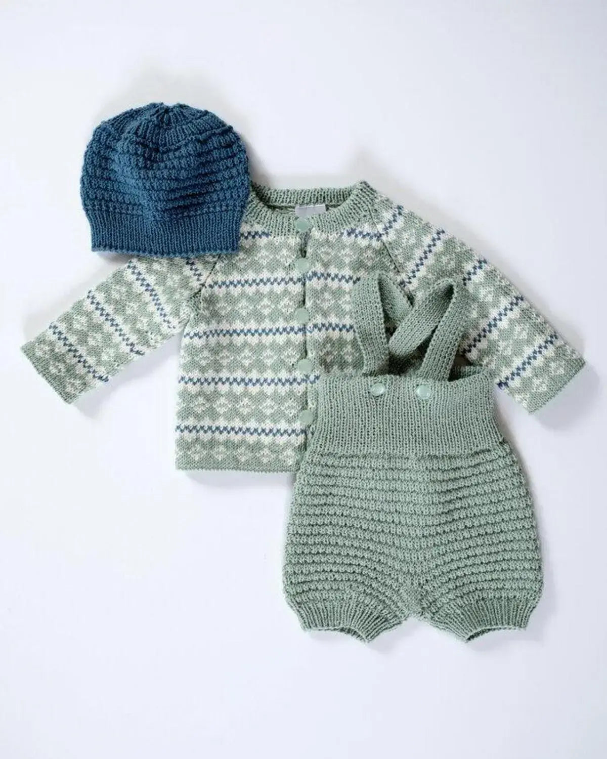 Smårolling Jakke, Kort Bukse og Lue, Lys Jade er et nydelig strikkesett som er perfekt for småbarn. Designet av Kari Haugen, er dette settet både praktisk og stilfullt.